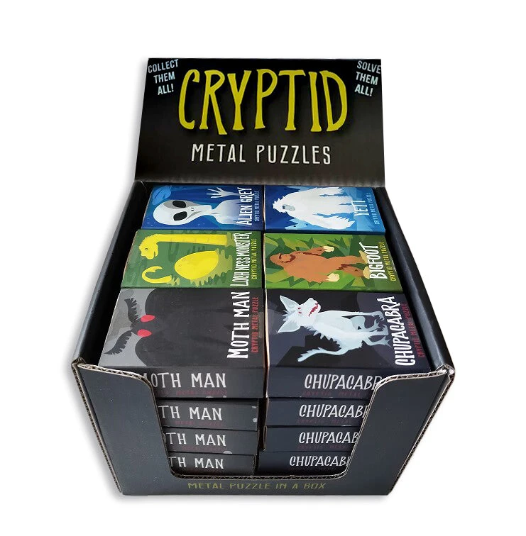 This 30-piece Puzzlebox set celebrates six legendary Cryptids. Bigfoot, Yeti, Chupacabra, Alien Grey, Moth Man, and the Lochness Monster unite in this clever display set of classic metal puzzles.
