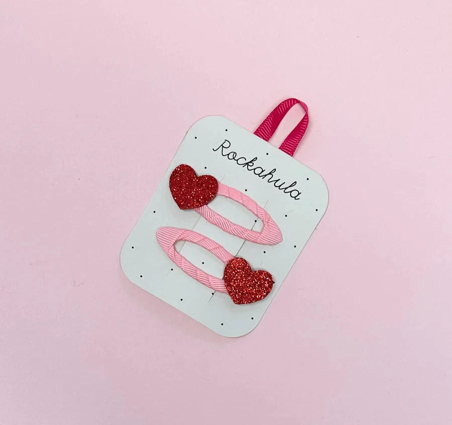 A pack of two scarlet red glittery hearts, set upon pretty pink grosgrain ribbon wrapped snap clips. These glittery heart shaped clips are loveable in every way!