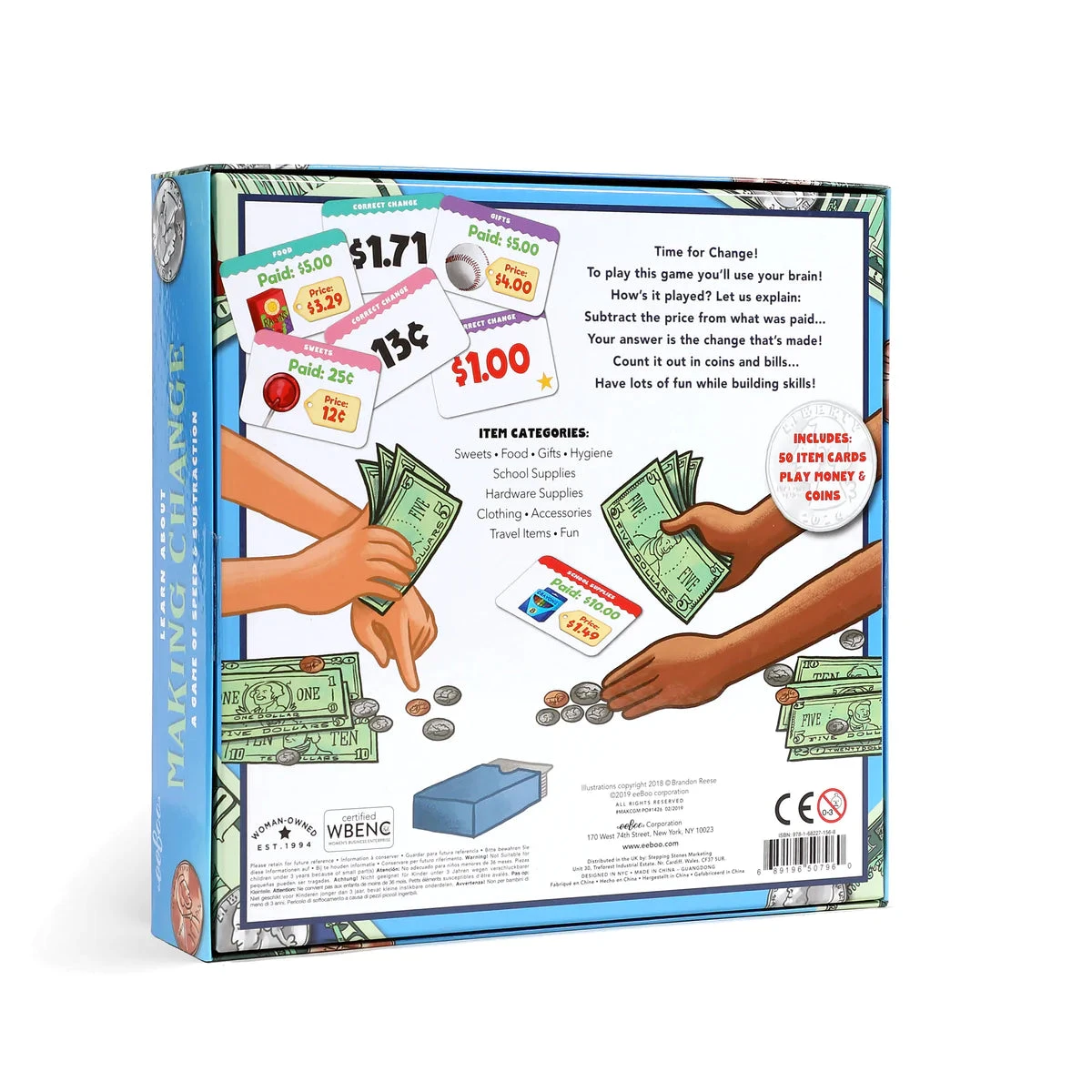 Making Change is an educational game where players use mental math to subtract the price of an item from the amount paid to make the correct change. Whoever collects the most items wins, get one item from each of 10 categories for bonus points. Making Change helps to build practical math skills.
