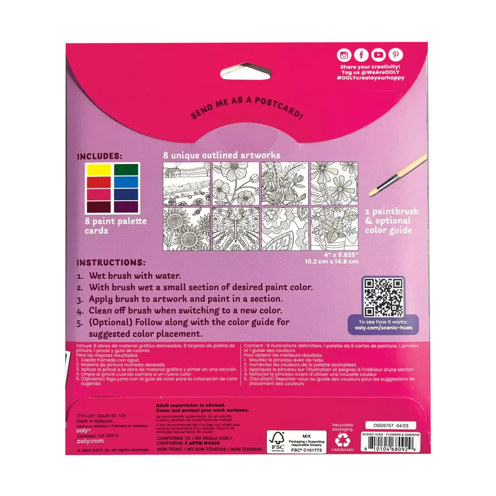 - Kit includes 8 different watercolor postcards, 8 paint palettes, 1 paint brush, and a color guide