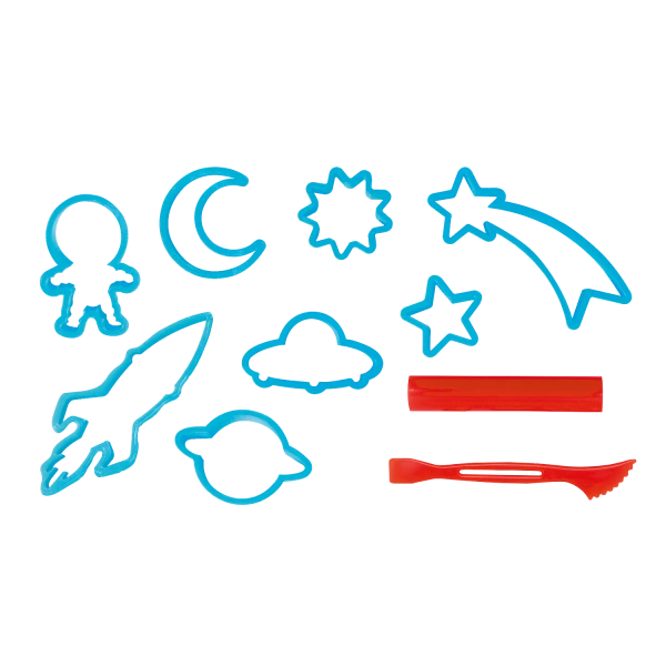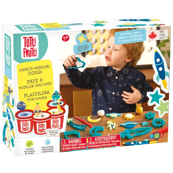 - Includes: Four 128g / 4.5 oz tubs Tutti Frutti sparkling modeling dough (blueberry, sweet mint, banana and pear), 8 large space-themed cookie cutters, 1 roller, 1 modeling tool, 1 x 10.75” x 8.25” x 3.5” zippered fabric carry bag.